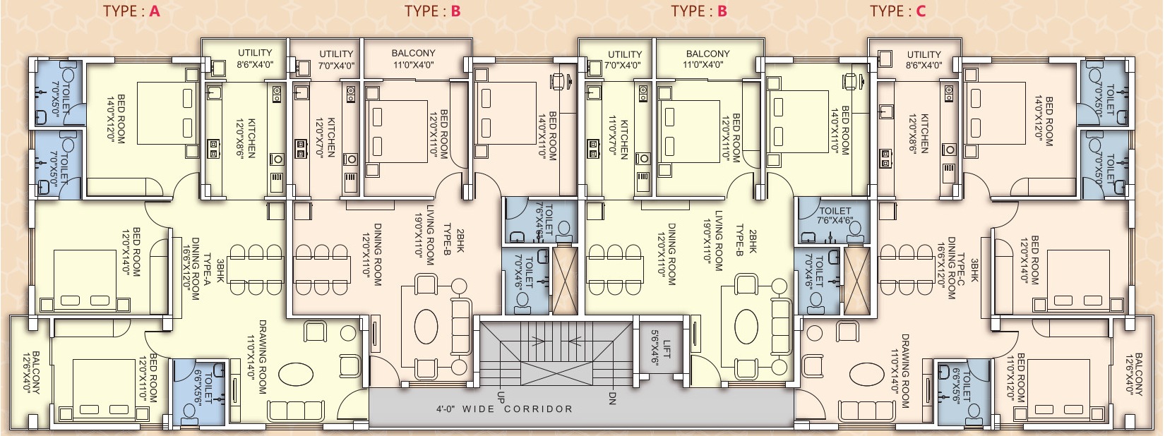 | Type | Flat | Carpet Area (Sft.) | Built Up Area (Sft.) | Saleable Area (Sft.) |